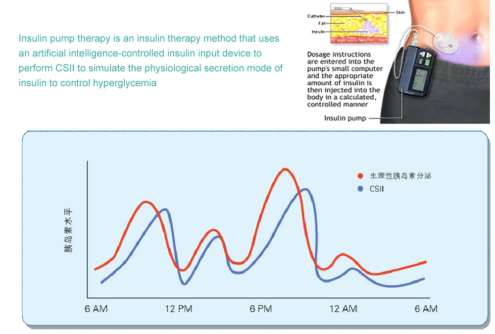 Pump insulin pump therapy is an insulin input device controlled by artificial intelligence. Through continuous subcutaneous infusion of insulin, it simulates the physiological secretion mode of insulin to control hyperglycemia. It is the most accurate, simple and convenient insulin infusion system at present. It is the best means and method for the intensive treatment of diabetes. The insulin pump is composed of an artificial intelligence control system containing a microelectronic chip, a mechanical pump system driven by a battery, a medicine reservoir, and The connected infusion tube and subcutaneous infusion device consist of four parts.